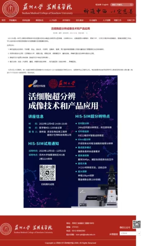 12月4日-21日期间,有一台超分辨荧光显微镜HIS-SIM在401-2214实验室进行样机Demo,全程有专业工程师上机。有实验需求的老师和同学可以联系现场负责人胡永康(电超视计科技